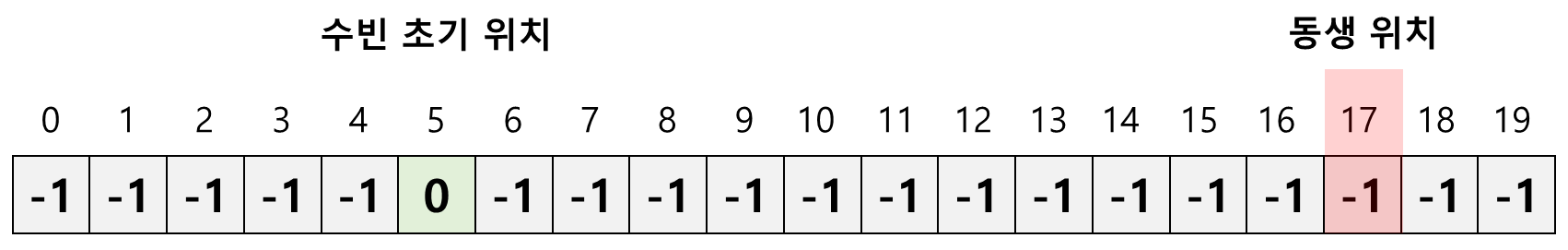 수빈이의 초기 위치가 5이기 때문에 배열의 다섯번째 인덱스 값을 0으로 변경해 준다.