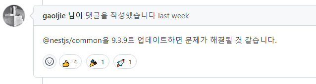 @nestjs/common 버전을 업그레이드 하고 다시 테스트를 진행하니 다음과 같이 떴다.