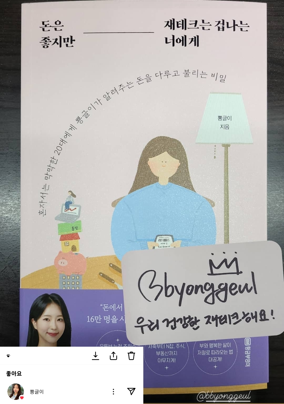 '돈은 좋지만 재테크는 겁나는 너에게' 라는 책인데 '무조건 아껴라', '무지출 챌린지를 해야 한다' 같은 진부한 말보단, 현명하게 소비하는 방법과 경제 지식 그리고 투자 공부 방법에 대해 쉽게 알려준다.