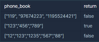 첫 번째 전화번호, “12”가 두 번째 전화번호 “123”의 접두사입니다. 따라서 답은 false입니다.