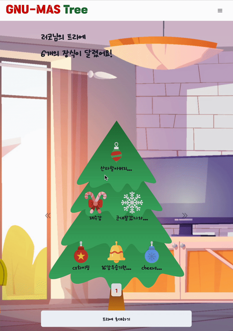 - 다른 학우의 트리에 장식품(메시지)를 달 수 있습니다.