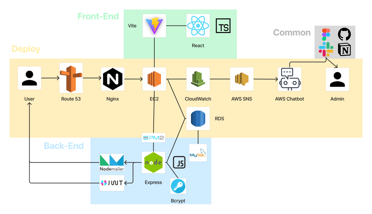 - EC2, Route 53, RDS, Nginx, CloudWatch, AWS Chatbot, AWS SNS, Pm2